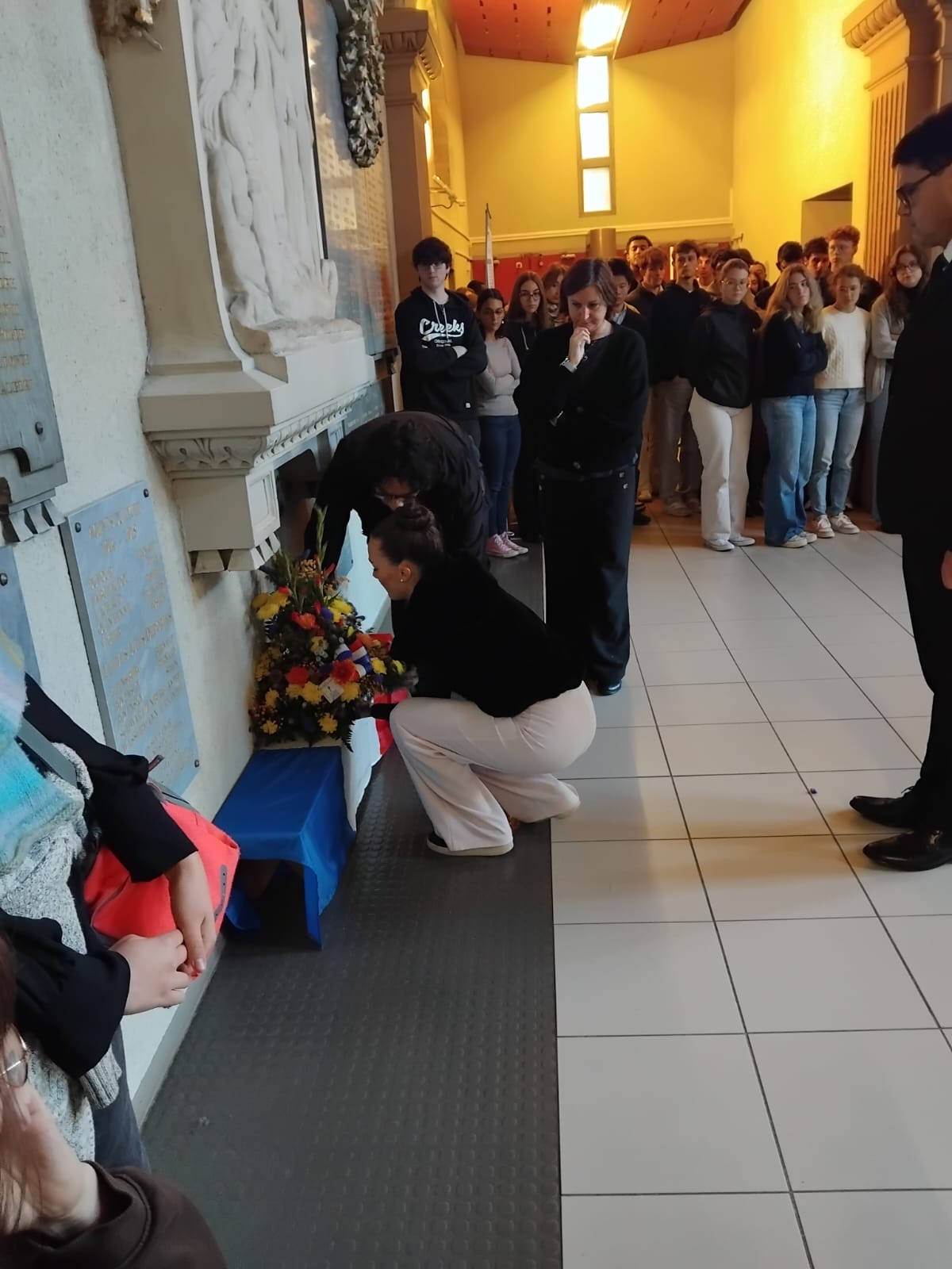 Dépôt de gerbe par les élèves aux pied du monument aux morts de l'établissement